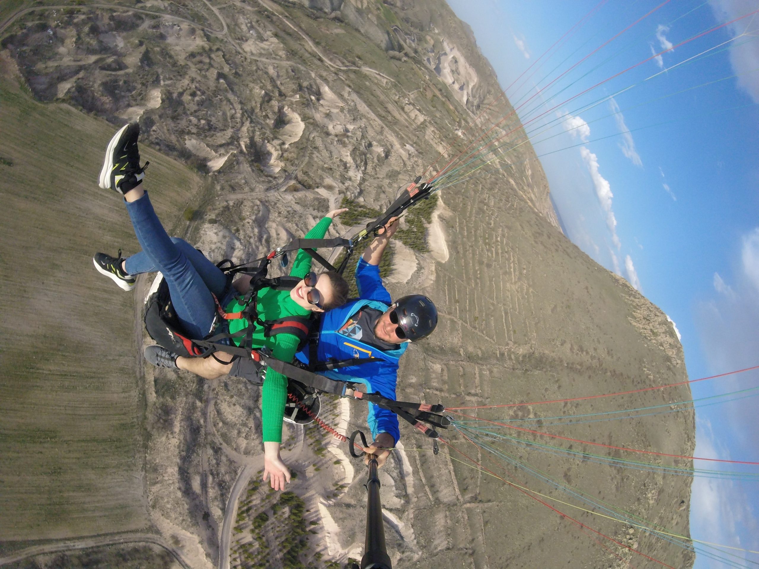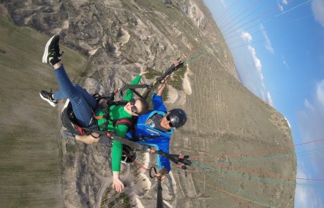 After a brief briefing at the time of the flight, we’ll gear up and begin our tandem paragliding flight. After a magnificent tandem paragliding flight with breathtaking views of Cappadocia, we’ll land at our landing area located beneath the mountain. During the flight, you can request your pilot to record footage with an action camera so you can capture and share the beautiful moments you experience. After all, who wouldn’t want to preserve a memory while flying freely in the sky!
